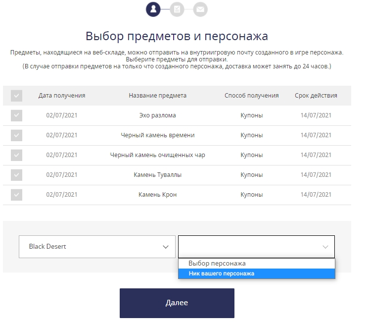 5. Выберите предметы, которые хотите получить, и персонажа, для которого они предназначены, и нажмите Далее.
